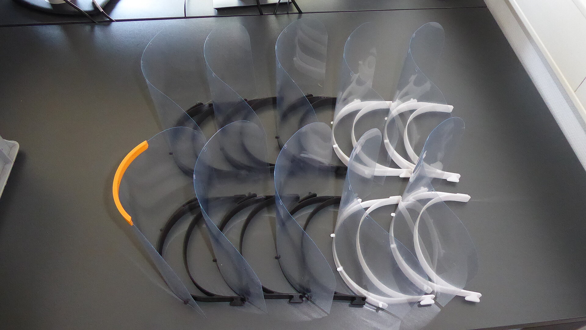 Auf Initiative unserer Geschäftsleitung wurde die Produktion noch ausgeweitet und von unserem Mitarbeiter Klaus Woitzik ganze Gesichtsschutzschilder gefertigt. Zunächst begann die Herstellung bei ihm zu Hause mit seinem privaten 3D-Drucker, anschließend ging die Produktion im Unternehmen auf der Ottmarsheimer Höhe weiter. Die fertigen Gesichtsschutzschilder wurden an umliegende Kliniken und an die Sammelstelle Maker vs. Virus gespendet, die das Equipment an entsprechende Organisationen verteilt. Durch mehrere Wochen Arbeit wurden auf diese Weise bisher an die 100 Gesichtsschutzschilder gedruckt, verpackt und verschickt.
