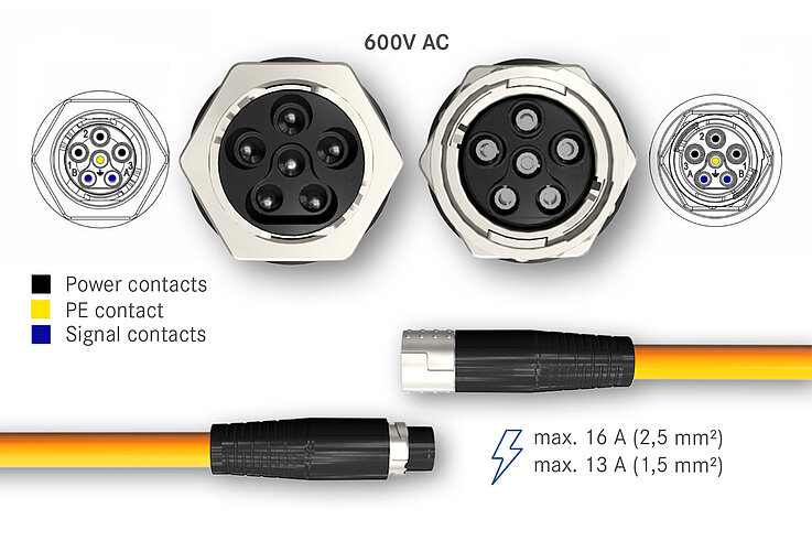 - 3 power contacts up to 16 A, 2 signal contacts up to 10 A, 1 PE contact